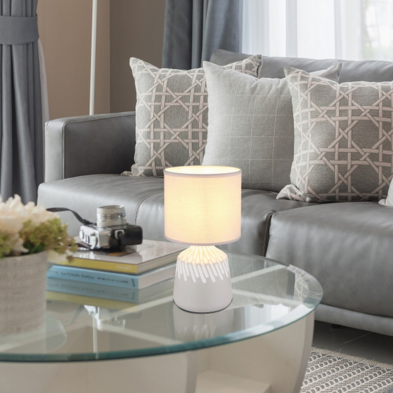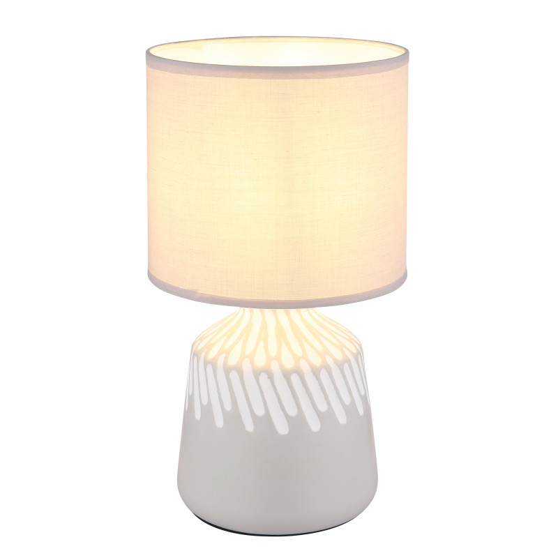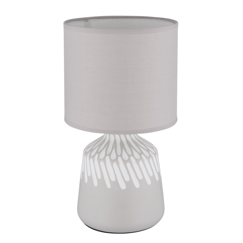 Stolové svietidlo RELA spája nadčasovú eleganciu s moderným dizajnom a bez problémov zapadne do každého obytného prostredia. Vďaka svojej okrúhlej základni, zvýraznenej jemnou dekoráciou a valcovému látkovému tienidlu z textilu popolavej farby vyžaruje lampa jemnú sofistikovanosť.